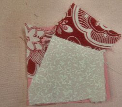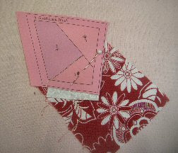 Next you will begin to add your next piece. You will place this piece right side down. Your fabrics will now be right sides together. Sew on the line that says 2. once completed, flip over press and trim close to the seam. Be sure you sew until you reach the seam allowance line.